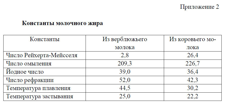 1) Масло, приготовленное из верблюжьего молока, отличается от коровьего белым цветом и по своим физическим свойствам приближается к салу. Кроме того, и физико-химические константы жира из верблюжьего молока существенно отличается от констант жира из коровьего молока.