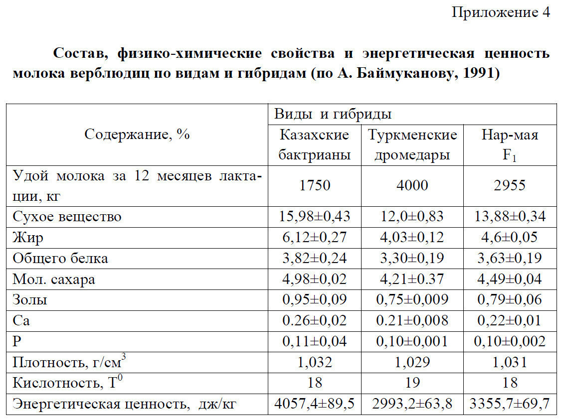 11) Верблюдоматки разных пород дают молоко различного химического состава. Об этом свидетельствуют результаты исследований молока проведенные А. Баймукановым (таблица приложения 4).