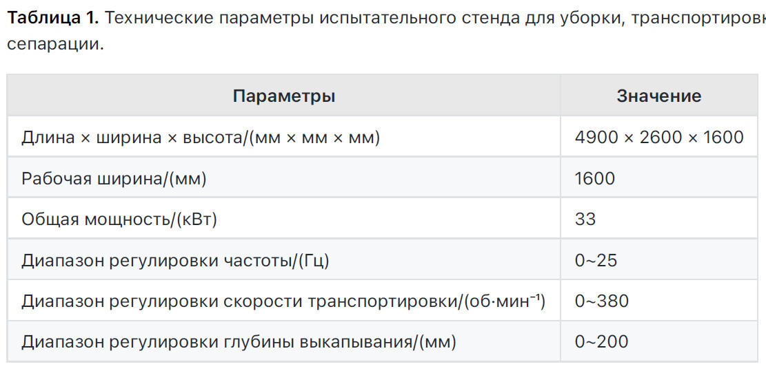 Синергетическое взаимодействие между спиральным транспортером и вибрационным ситом способствовало разрыхлению смеси. Это способствовало просачиванию песка через отверстия сита и нарушало структурную cohesive смеси. Следовательно, этот процесс улучшал сепарацию тигрового ореха и корней от песчаной матрицы. Рабочие параметры платформы для испытаний уборки, транспортировки и сепарации подробно описаны в таблице 1.