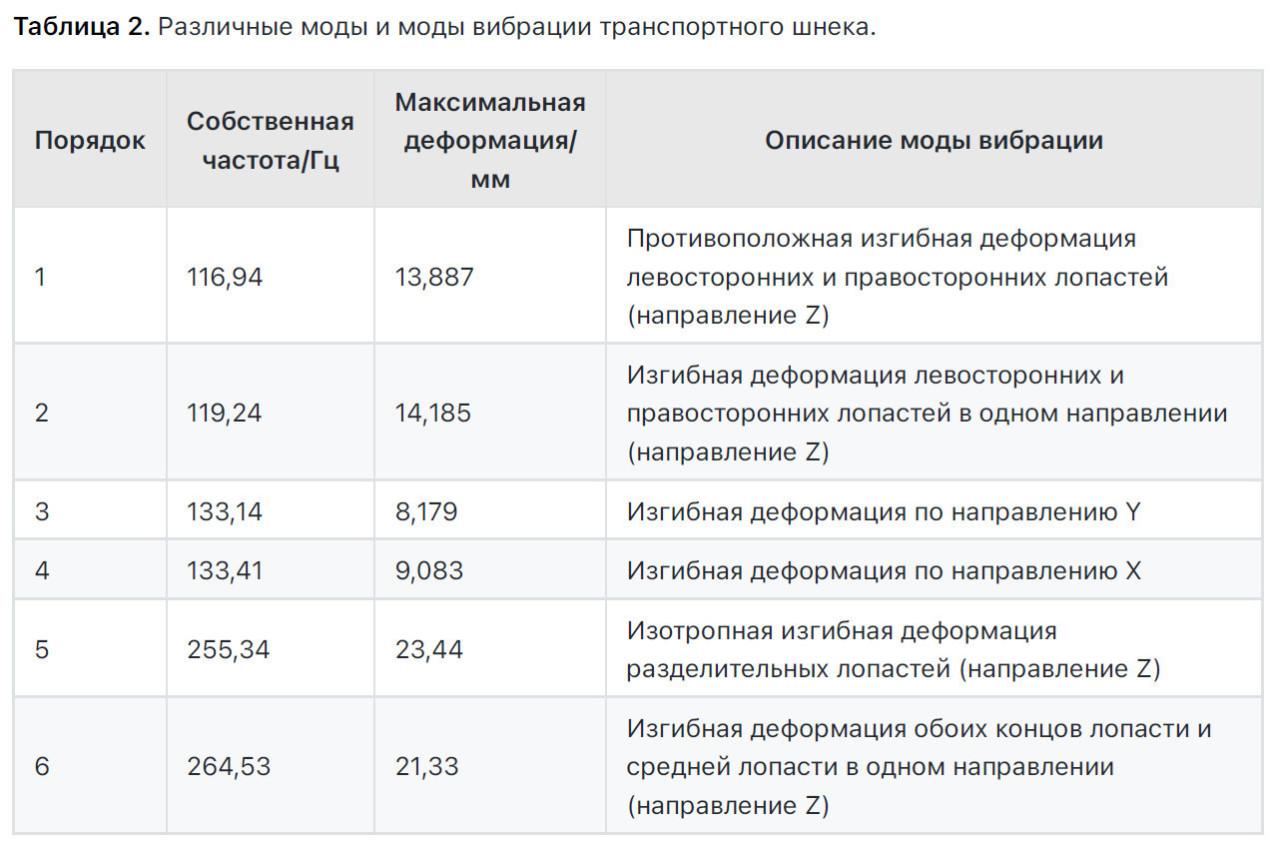 Предопределенная скорость вращения шнека 280 об/мин была использована, и рабочая частота возбуждения шнека была впоследствии рассчитана как 4,67 Гц с использованием формулы собственной частоты f - п/60. Сравнительный анализ результатов моделирования и теоретических результатов показал, что рабочая частота возбуждения была значительно ниже первых шести собственных частот мод вибрации шнека. Это открытие указывало на отсутствие резонанса во время работы и подтверждало рациональность дизайна.