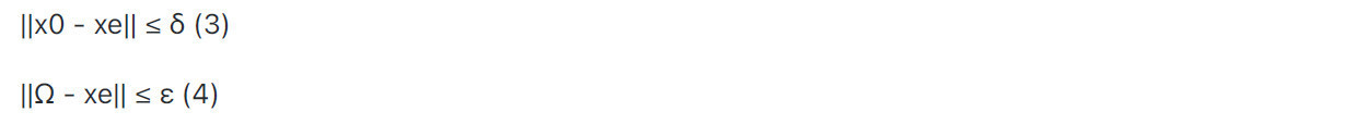 В фактических инженерных проблемах, если состояние равновесия хе устойчиво в смысле Ляпунова и устойчивое состояние хе возмущено, оно в конечном итоге сойдется к хе. Согласно второму закону Ляпунова, т.е. достигает функции Ляпунова V, которая положительно определена, и V отрицательно определена.