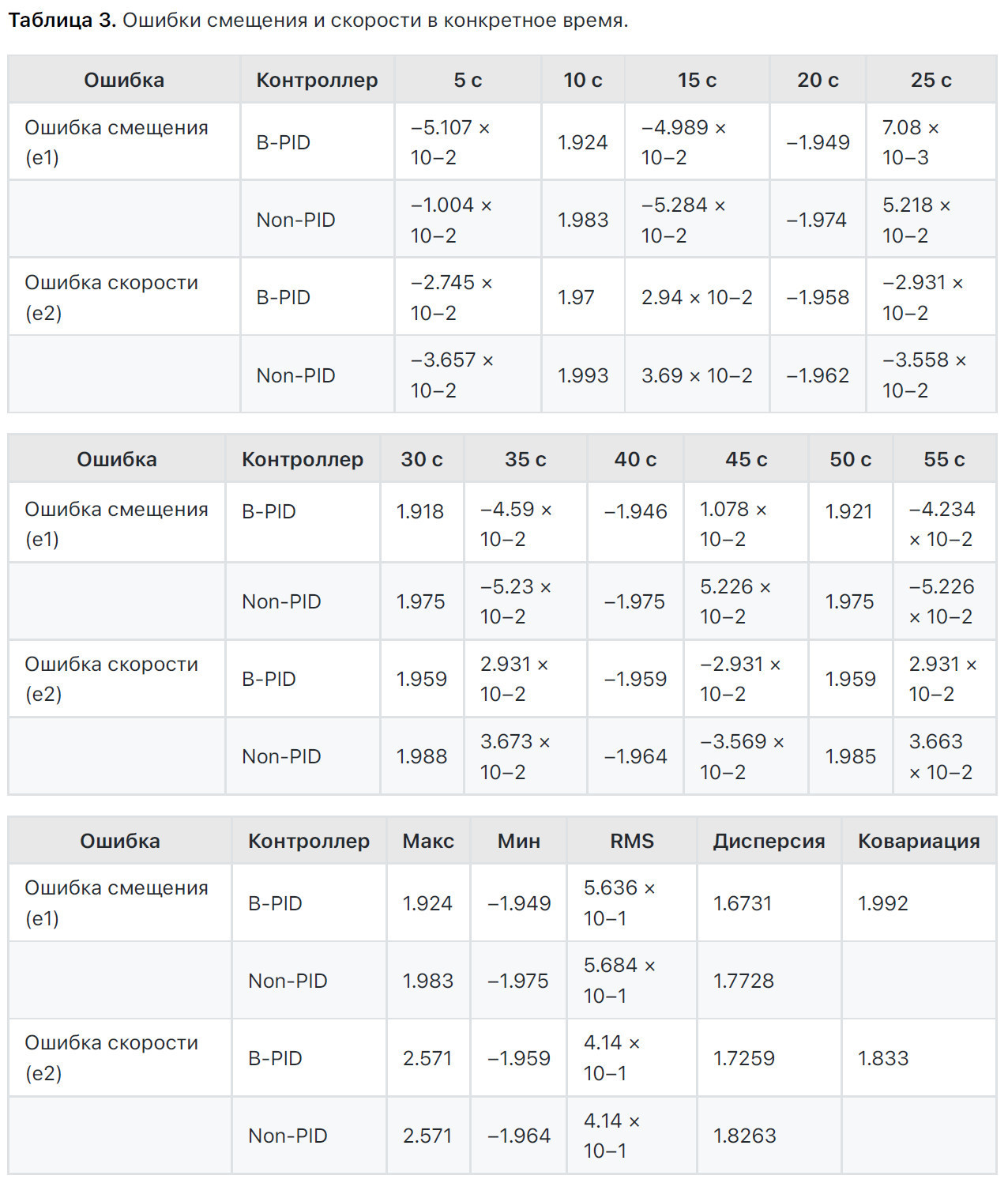 Анализ рисунков 14 и 15 и таблицы 3 показывает, что контроллер В-PID демонстрирует значительно меньшие ошибки смещения и скорости, с более низкими значениями среднеквадратичного (RMS) и дисперсии по сравнению с Non-PID. Это дальше подтверждает превосходную производительность В-PID. Кроме того, положительная ковариация между ошибками смещения и скорости для обоих контроллеров В-PID и Non-PID указывает на положительную корреляцию между этими двумя переменными.