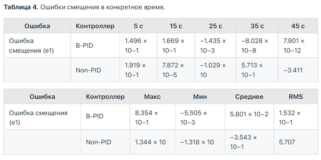 Анализ рисунков 16 и 17, а также таблицы 4, показывает, что под условием ступенчатых возмущений, введенных в систему, контроллер B-PID демонстрирует меньшую ошибку смещения. Кроме того, среднеквадратичное (RMS) ошибки смещения для контроллера B-PID, которое составляет 1,532 х 10-1, значительно ниже, чем для контроллера Non-PID, с значением RMS 5,707. Это указывает, что контроллер B-PID обладает превосходной устойчивостью по сравнению с контроллером Non-PID.