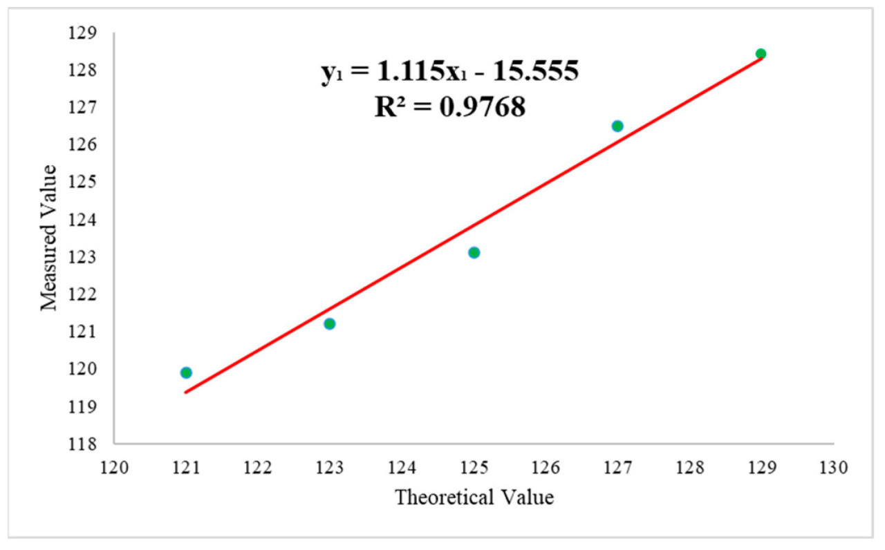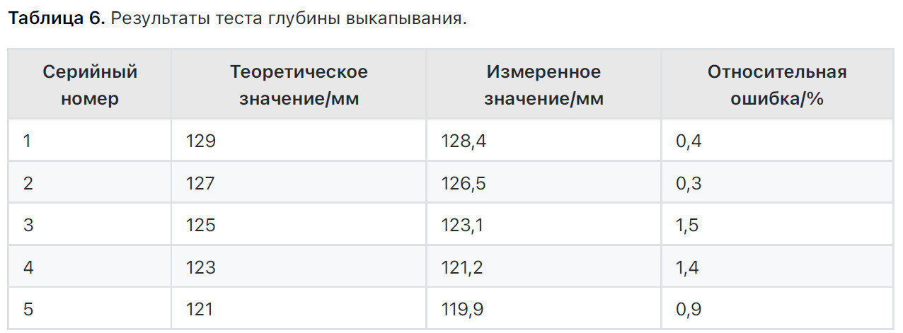 Во время процесса тестирования регулировки глубины выкапывания производились на интерфейсе HMI путем ввода значений 129 мм, 127 мм, 125 мм, 123 мм и 121 мм соответственно. Пять тестовых точек были выбраны в тестовой области, и глубина выкапывания измерялась с использованием линейки в каждой точке. Каждое измерение повторялось трижды, и записывалось арифметическое среднее. Полученные данные представлены в таблице 6. Как указано в таблице, относительные ошибки в пяти тестовых точках составляли 0,4%, 0,3%, 1,5%, 1,4% и 0,9%, с максимальной относительной ошибкой 1,5%, которая удовлетворяет требованиям. Кроме того, был создан график рассеяния с теоретическими значениями глубины выкапывания на оси х и измеренными значениями на оси у, и математическая кривая аппроксимации отношения была подогнана к точкам данных, что можно увидеть на рисунке 20. Полученная математическая связь между теоретическими и измеренными значениями — у - 1,115х - 15,555, с значением R2 0,9768, указывающим на надежность модели корректировки.
