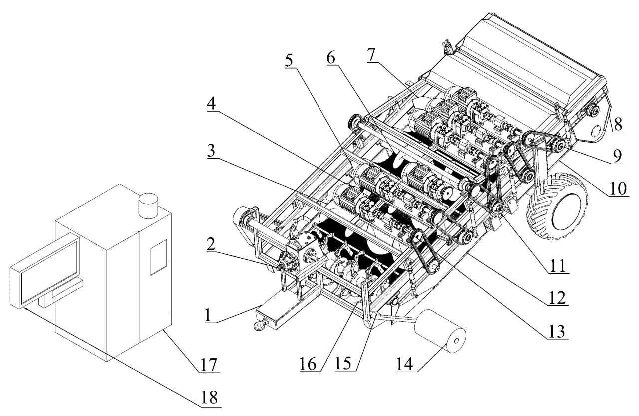 Рисунок 1. Глобальная структура платформы для уборки, транспортировки и сепарации. 1. Рама, 2. Устройство ввода мощности, 3. Первая ступень шнека, 4. Устройство мощности скручивания, 5. Вторая ступень шнека, 6. Третья ступень шнека, 7. Четвертая ступень шнека, 8. Бункер для материала, 9. Пятая ступень шнека, 10. Заднее вибрационное сито, 11. Устройство возбуждения, 12. Переднее вибрационное сито, 13. Датчик крутящего момента, 14. Колесо ограничения глубины, 15. Датчик угла наклона, 16. Устройство ротационного вспашки для выкапывания, 17. Электрический блок управления, 18. Устройство визуализации.