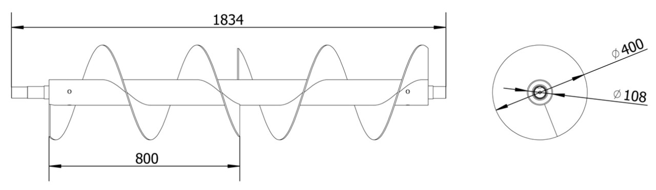 Лопасти одноступенчатого спирального шнекового транспортера были спроектированы как с левым, так и с правым винтом. Противоположные направления винта достигали транспортировки материала к центру. Каждая ступень шнекового транспортера использовала симметричное распределение лопастей с левым и правым винтом. Конкретно, рабочие длины лопастей с левым и правым винтом были идентичны. Комбинированное действие этих двух лопастей винта способствовало передаче материала на последующую ступень шнекового транспортера, тем самым повышая коэффициент использования каждой ступени. Размеры спирального шнекового транспортера иллюстрированы на рисунке 2. Вал шнекового транспортера имел длину 1834 мм. Рабочие длины секций лопастей с левым и правым винтом составляли по 800 мм каждая. Внешний диаметр вала шнекового транспортера составлял 108 мм, в то время как внешний диаметр лопастей винта — 400 мм.