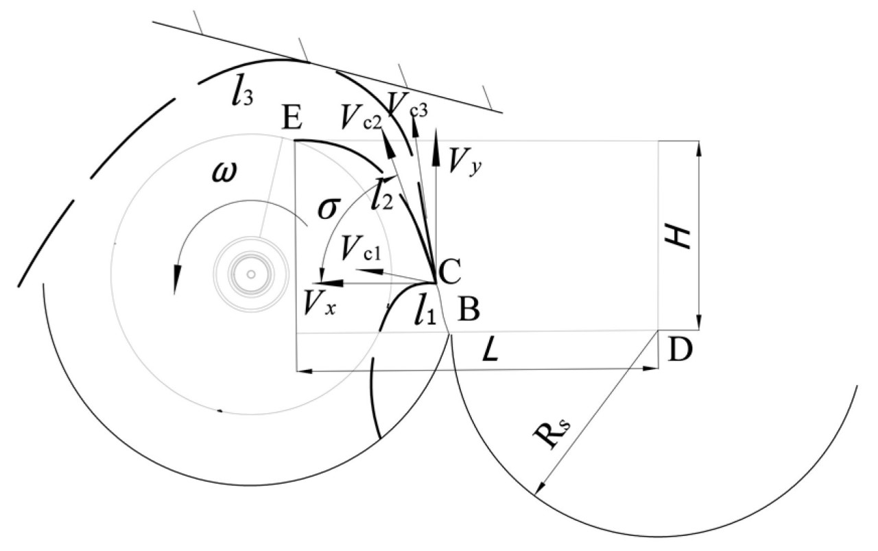 В процессе выброса материала скорость вращения предыдущей ступени шнека определяла линейную скорость подачи последующей ступени. Конкретно, увеличенная скорость шнека приводила к более высокой начальной скорости выброса, как иллюстрировано на рисунке 3. Когда начальная скорость выброса (Vol) была установлена на более низкое значение во время выброса песка, гравитационные эффекты приводили к траектории материала (11), которая не напрямую пересекала зону осевого действия шнека, приводя к накоплению материала в нижней части шнека и препятствуя транспорту. Напротив, высокая скорость выброса (Vc3) вызывала удар песка о корпус машины в верхней части шнека, приводя к отскоку и предотвращению осевого движения (траектория I3). Оптимальная начальная скорость выброса (Vc2), промежуточная между вышеуказанными крайностями, приводила к тому, что песок эффективно проецировался в шнек для осевого транспорта по траектории I2. Для максимизации пропускной способности песка, продления времени удержания материала в шнеке и повышения эффективности удаления песка была нацелена траектория I2. Это требовало скорости вращения шнека, которая избегала как чрезмерно высоких, так и низких значений. Последующий выбор экспериментальных параметров включал исследование скорости вращения шнека, с диапазоном переменных, информированным предыдущими результатами исследовательской группы, которые установили максимальную скорость вращения шнека 280 об/мин [22].