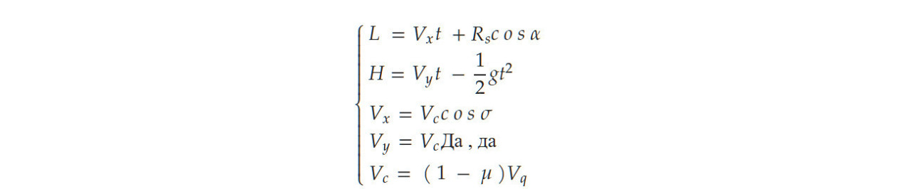 В формуле L представляет горизонтальное расстояние между материалом и валом шнека на его апогее, составляющее 580 мм; Н — вертикальное расстояние от материала до вала шнека на его высшей точке, в диапазоне от 210 до 400 мм. Радиус сита Rs составлял 0,254 м. Vx обозначает компоненту начальной скорости материала в направлении X, в то время как Vy указывает компоненту в направлении Y. Время для достижения материалом его зенита обозначается t; а — угол между машиной и землей, принятый как 10°. о обозначает угол между скоростью выброса материала и землей, измеренный как 65,5°. Коэффициент трения между песком и сталью ц равен 0,43. Vq — линейная скорость материала на периферии предыдущего корпуса сита, a Vc — начальная скорость, с которой материал был выброшен.
