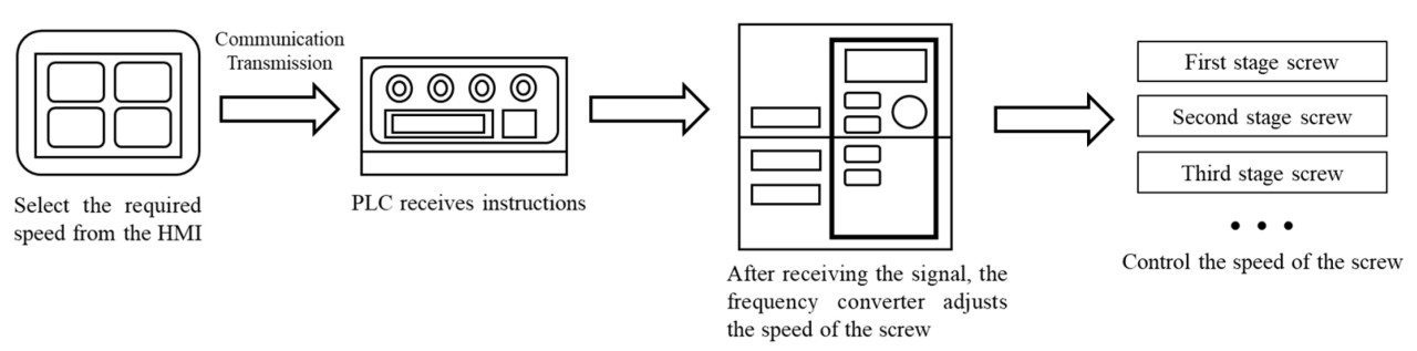 Во время работы шнекового устройства оператор первоначально выбирал необходимую скорость шнека через интерфейс взаимодействия человека и машины (HMI). Затем верхний компьютер HMI передавал инструкции нижнему компьютеру Programmable Logic Controller (PLC) через сигнал связи. После получения этого сигнала ПЛК передавал инструкцию для модуляции преобразователя частоты, который, в свою очередь, регулировал скорость двигателя, изменяя частоту его рабочего питания, тем самым достигая предполагаемой регулировки скорости вращения шнека. Соответствующая блок-схема представлена на рисунке 4.