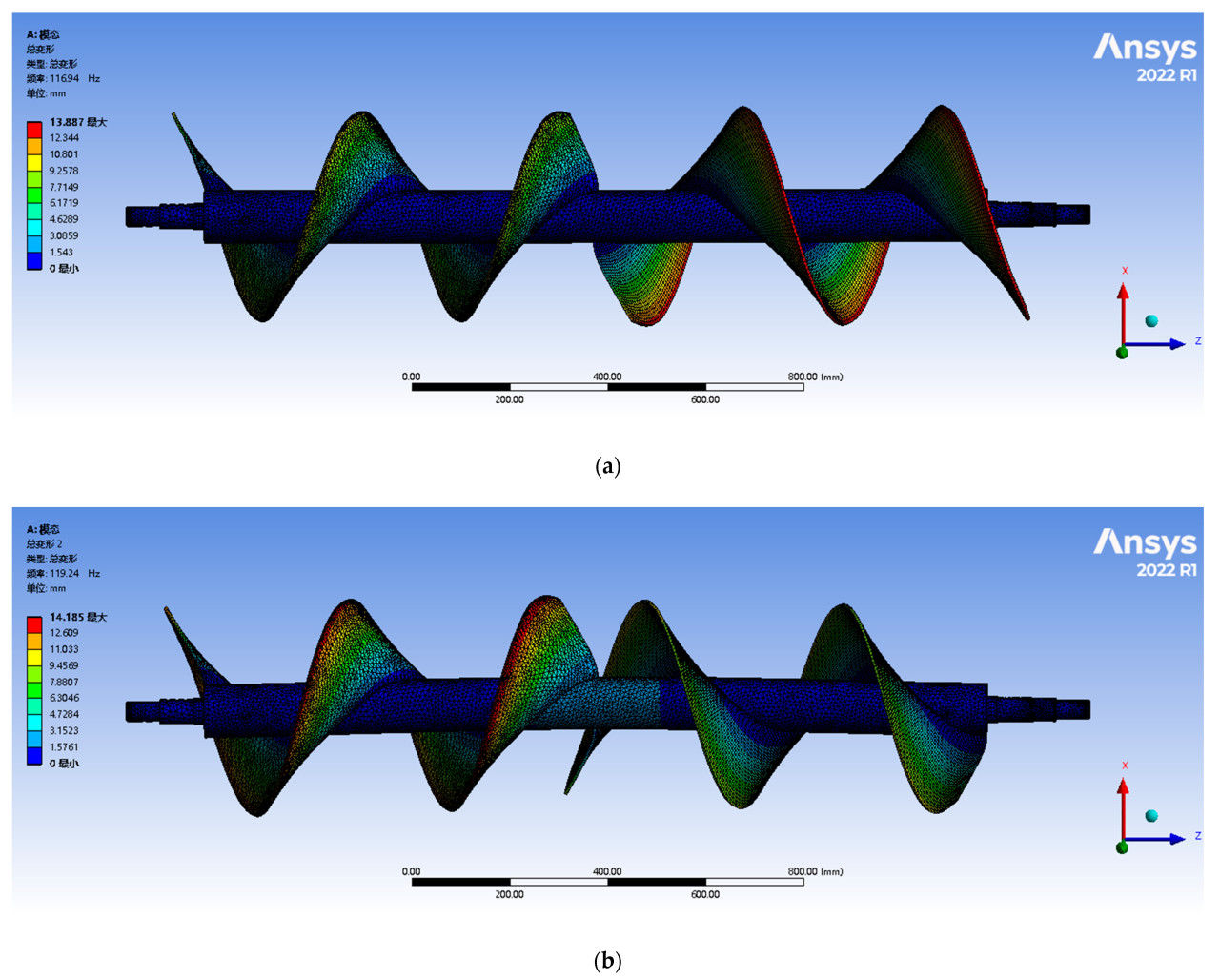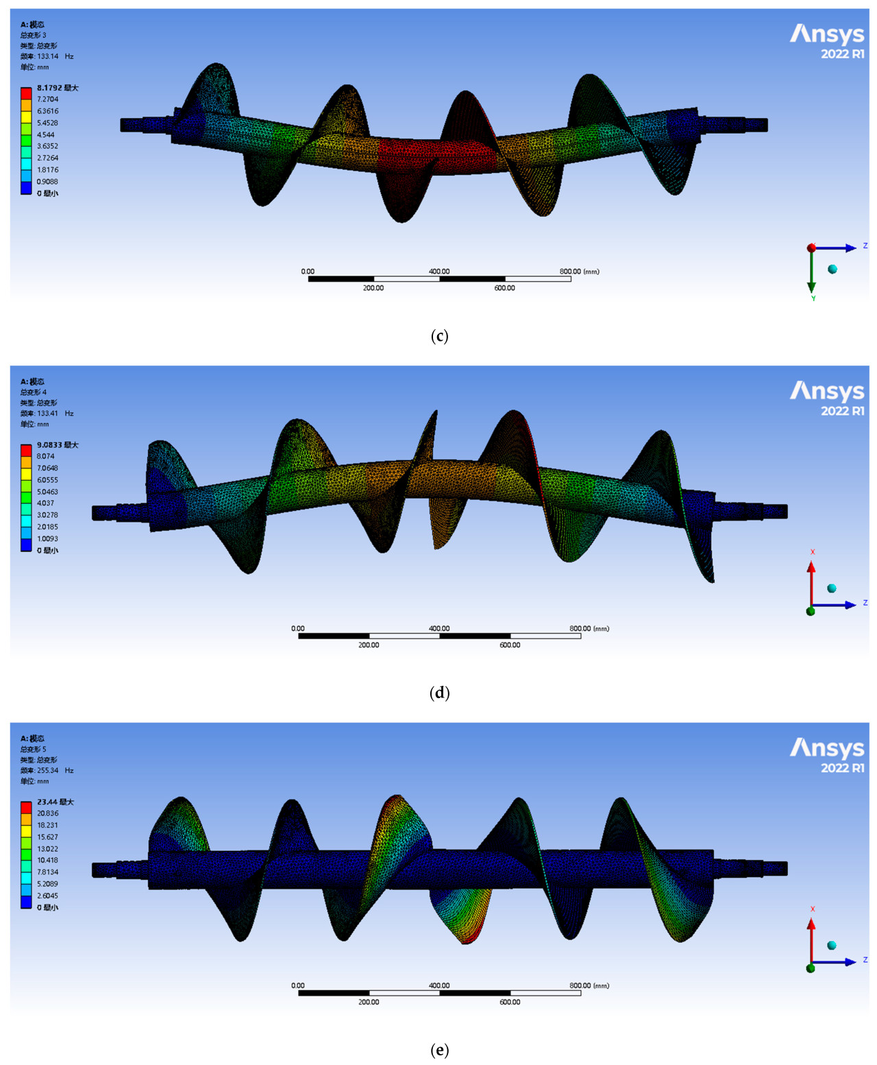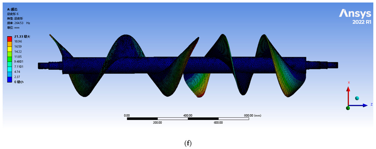 Из таблицы 2 было замечено, что начальные шесть собственных частот шнека варьировались от 116,94 до 264,53 Гц, с деформацией смещения, варьирующейся между 8,179 и 23,44 мм. Шестая мода демонстрировала самую высокую собственную частоту 264,53 Гц, в то время как пятая мода демонстрировала самую большую деформацию смещения 23,44 мм. Каждая из этих собственных частот была связана с ее конкретной модой вибрации. Распределение интенсивности вибрации по разным частям шнека и его вибрационный отклик под каждой соответствующей модой были проанализированы. Интервалы между соседними частотами были заметно близки в пределах первых шести собственных частот. Собственные частоты, соответствующие друг другу, отличались в основном направлением вибрации, но конфигурации мод вибрации оставались поразительно похожими. Как показано на рисунке 4, вибрация шнека преимущественно включала изгибную деформацию как центра вала шнека, так и спиральной лопасти. Под первой, второй, пятой и шестой модами вибрации максимальная деформация происходила на внешнем крае спиральной лопасти. Напротив, под условиями третьей и четвертой мод вибрации максимальная деформация была центрирована на валу шнека. Этот анализ подчеркивает сложное вибрационное поведение, присущее структурной динамике шнека.