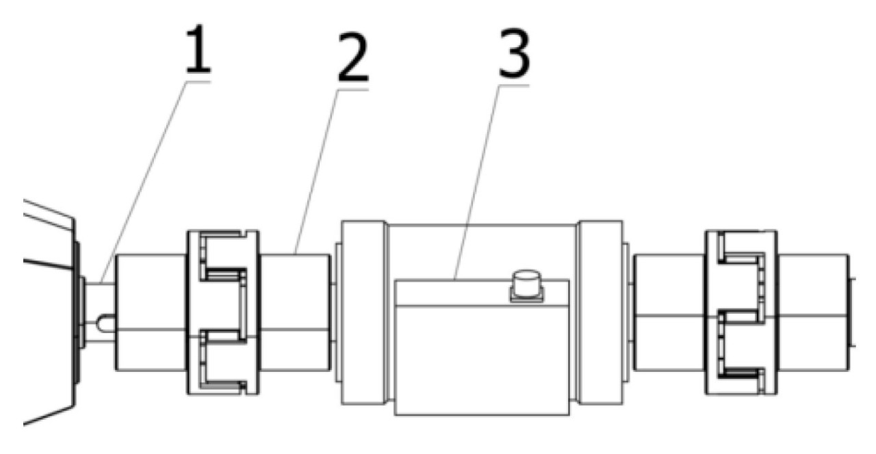 Рисунок 6. Аппаратная структура системы обнаружения крутящего момента шнека. 1. Вал двигателя, 2. Муфта, 3. DYN-210 датчик крутящего момента.