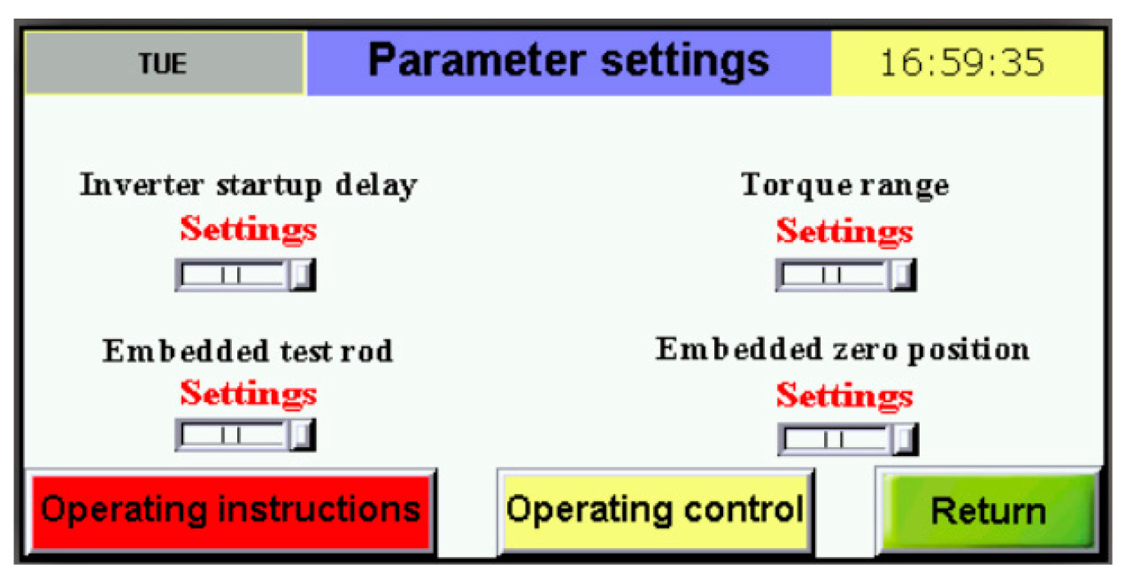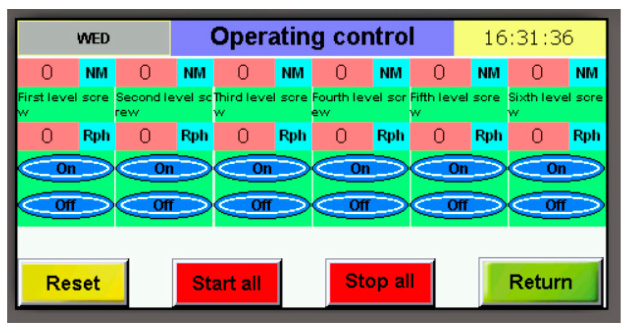 Нижний компьютер этой системы использовал ES2 ПЛК из серии DVP компании DELTA (DELTA, Уцзян, Китай), в то время как верхний компьютер использовал resistive сенсорный экран MT6071IQ от Willcom Technology Со., Ltd. (Willcom, Шэньчжэнь, Китай). Датчик крутящего момента DY-300N Bengbu (DaYang, Бенгбу, Китай) был выбран для измерения рабочего крутящего момента шнека. Интерфейс человека-машины (HMI) в основном состоял из модуля статуса работы и модуля установки параметров, который позволял регулировку обнаружения скорости вращения и крутящего момента. Интерфейс HMI был разработан с использованием программного обеспечения DOPSoft (1.01.10). Дизайн интерфейса представлен на рисунке 7.