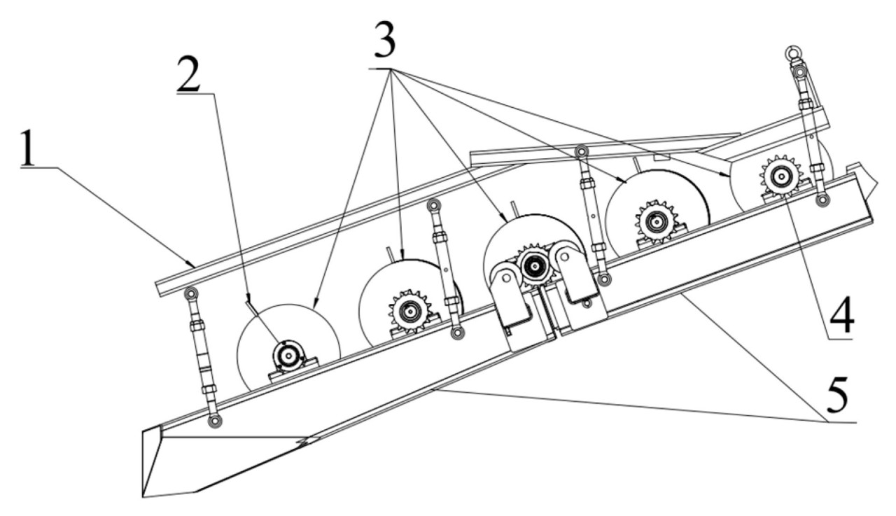 Рисунок 8. Схематическая диаграмма структуры вибрационного сита. 1. Структура рамы, 2. Система антиблокировки, 3. Шнековый транспортер, 4. Система передачи мощности, 5. Вибрационное сито.