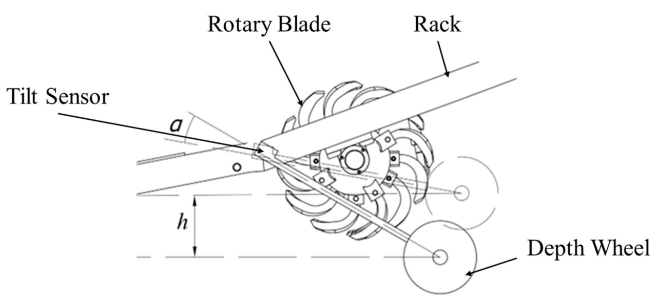 Во время работы ротационный резак уборочного комбайна входил в почву, выполняя действие вспашки. Глубина этой операции регулировалась колесом ограничения глубины. Контакт между колесом ограничения глубины и почвой генерировал реактивную силу, которая, через опорный стержень, поднимала передний конец уборочного комбайна (т.е. устройство ротационного вспашки). Датчик наклона, расположенный на опорном стержне, измерял угол а между опорным стержнем и землей. Эта угловая информация преображалась в электрический сигнал передатчиком и впоследствии передавалась контроллеру. Глубина вспашки h ротационного ножа затем вычислялась с использованием предварительно установленной геометрической математической модели, относящейся к глубине вспашки и измеренному углу. Эта рассчитанная глубина наконец передавалась на интерфейс человека-машины (HMI). Геометрическое соотношение изображено на рисунке 9.