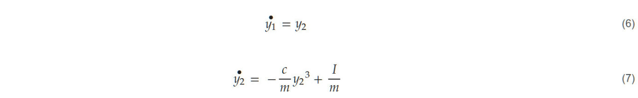 Эта статья моделировала устройство обнаружения глубины выкапывания следующим образом. Масса устройства была представлена m, входная приводная сила F была I, смещение у1 было у, и скорость у2 была у. Поскольку сила трения почвы на устройстве обнаружения является нелинейной силой, положительно коррелированной со скоростью у2 при обнаружении глубины выкапывания [42], для облегчения расчетов эта статья предположила, что сила трения f - су23, где с был коэффициентом масштаба. Согласно второму закону Ньютона, можно установить следующую математическую модель: