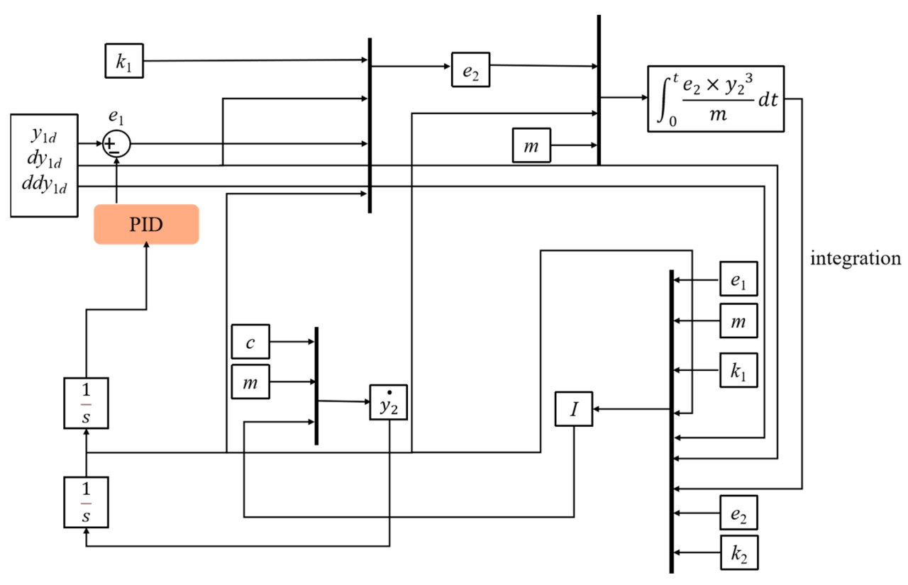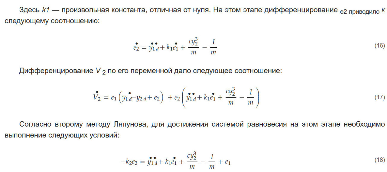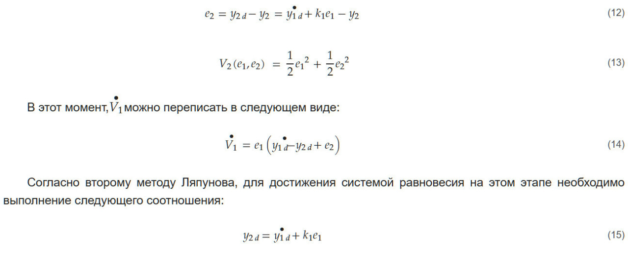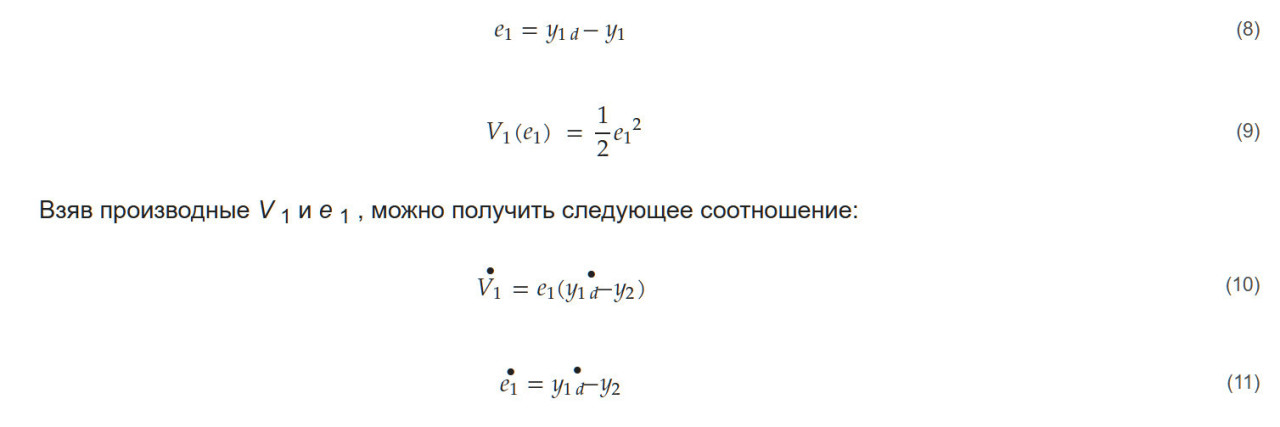 В данной статье предлагается использовать метод обратного шага в сочетании с ПИД-регулятором для разработки контроллера для системы регулирования глубины при выемке грунта. В следующем разделе представлено подробное описание этого процесса. Если предположить идеальный сценарий, в котором рабочее смещение механизма определения глубины обозначено какy 1d, ошибка смещения представлена какe 1, а для задания смещения задана функция ЛяпуноваV 1, то можно вывести следующее соотношение: