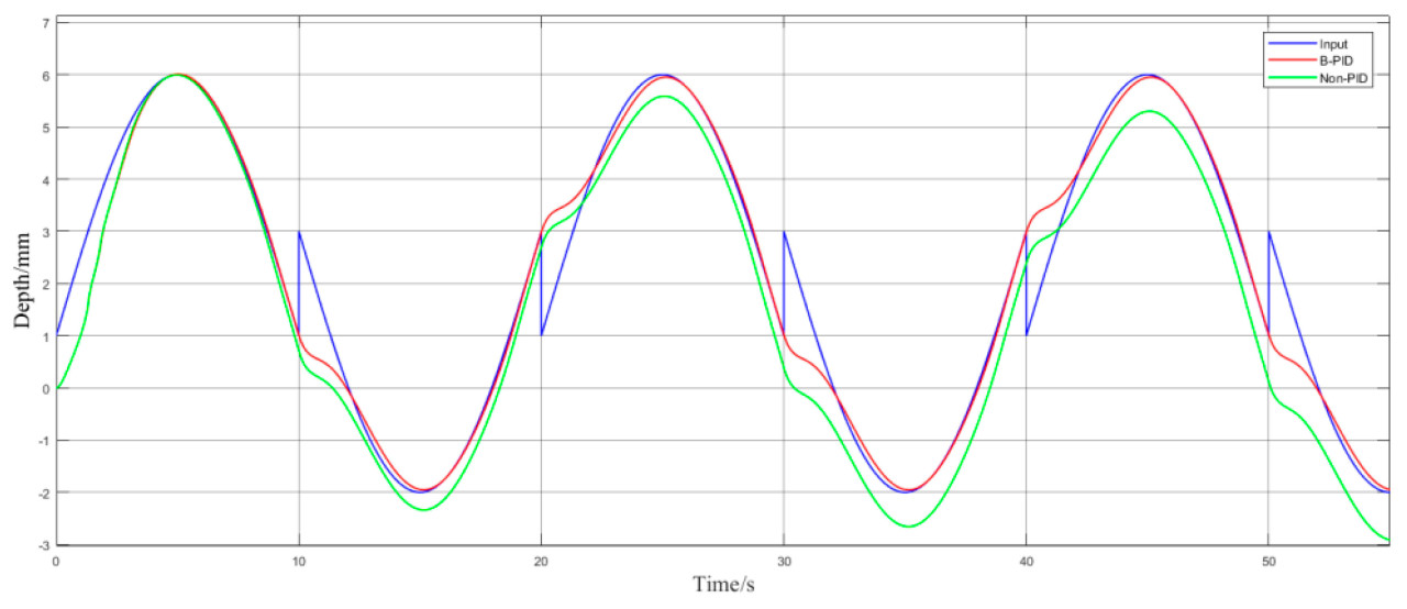 Эта секция проверяла эффективность предложенного метода. Учитывая высоко нелинейную подземную рабочую среду устройства глубины выкапывания, это исследование использовало модули Simulink в MATLAB 2017b для ввода синусоидальных и случайных смещений, позволяя сравнительный анализ предложенного контроллера B-PID и контроллера обратного шага без интеграции PID. Цель состояла в наблюдении отслеживания траектории обоих контроллеров для у1. Рисунки 12 и 13 представляют результаты симуляции.