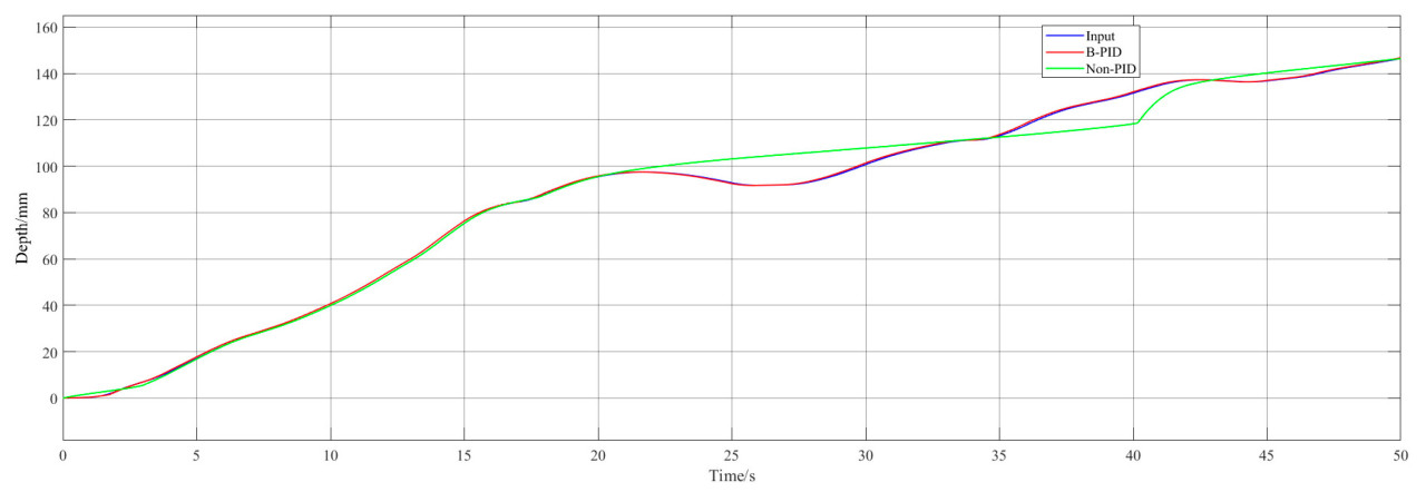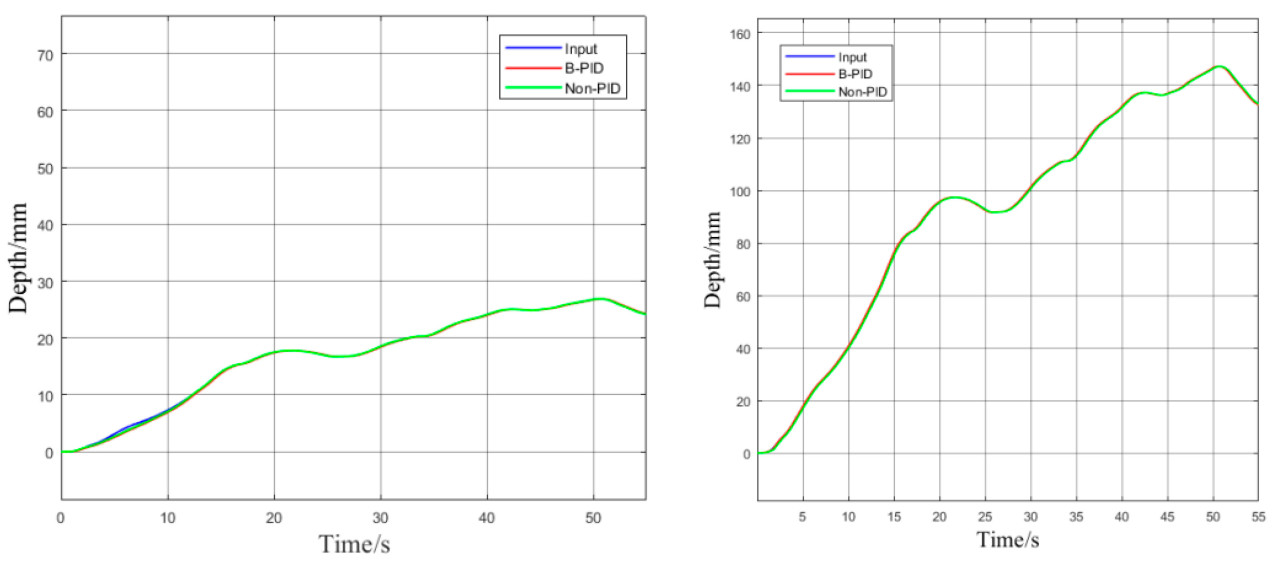(2) Был предложен адаптивный контроллер, интегрирующий обратный шаг и PID (B-PID), для улучшения отслеживания траектории и обнаружения глубины во время уборки тигрового ореха. Была разработана всесторонняя модель управления, учитывающая демпфирование движения и компенсацию ошибки смещения. Оценка производительности через симуляции Simulink сравнила контроллер В-PID с альтернативными стратегиями управления. Результаты из этих экспериментов демонстрируют, что модель В-PID значительно улучшает отслеживание траектории, предлагая эффективное управление для обнаружения глубины выкапывания;