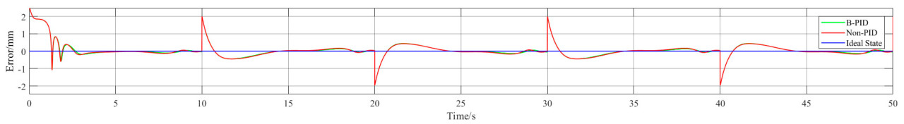 Чтобы сравнить устойчивость контроллеров B-PID и Non-PID, это исследование включило ступенчатые возмущения в траекторию, сгенерированную случайным белым шумом. Результаты симуляции иллюстрированы на рисунке 16. Ошибки смещения иллюстрированы на рисунке 17.