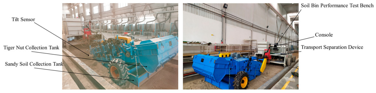 В мае 2023 г. практические тесты проводились в лаборатории производительности почвенного канала Школы механического и электротехнического машиностроения Университета Шихэцзы для оценки модулей контроля скорости шнека транспортирующего и сепарационного устройства, модуля обнаружения глубины выкапывания и модуля контроля частоты вибрации. Тестовые материалы, включая комплексы тигровый орех-корень-песок, получены из базы посадки тигрового ореха Второй компании, 54-го полка, Третьей дивизии Производственно-строительного корпуса Синьцзяна. Перед тестами почва в области теста почвенного канала выравнивалась и уплотнялась с использованием устройства выравнивания, устройства орошения и устройства уплотнения, которые являются частью установки почвенного канала. Материалы комплекса тигровый орех-корень-песок также были разложены в области теста почвенного канала в соответствии с паттерном посадки.