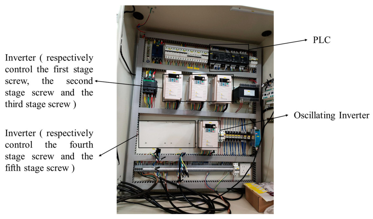 Устройство контроля скорости шнека включало сенсорный экран, ПЛК, двигатель, инвертор и другие аппаратные компоненты. Учитывая, что тигровый орех выращивается в основном в песчаной почве, и уборка генерирует значительное количество пыли, обзор соответствующей литературы [23-25] информировал выбор resistive сенсорного экрана для обеспечения надежной работы в суровой среде. Это решение учитывало стоимость, функциональность и устойчивость к окружающей среде, в конечном итоге приведя к выбору resistive сенсорного экрана MT6071IQ (Willcom, Шэньчжэнь, Китай). Выбор ПЛК основывался на конкретных рабочих требованиях, включая количество входов/выходов (I/O), необходимые функциональные модули, рабочую среду и скорость обработки. После обзора соответствующей литературы [26-30] был выбран ПЛК серии DELTA DVP ES2 (DELTA, Уцзян, Китай) за его соответствие рабочим требованиям уборочного комбайна для тигрового ореха. Этот ПЛК был соединен с HMI через порт RS422, подключен к шести преобразователям частоты через порт связи RS485 и связан с модулем расширения аналоговых сигналов через выделенную линию связи. Для облегчения эффективного контроля и надежной работы во время процесса шнековой транспортировки и вибрационного просеивания для удаления тигрового ореха и другого растительного материала был выбран трехфазный асинхронный двигатель серии YE3. Наконец, учитывая рабочие нужды уборочного комбайна для тигрового ореха, был выбран преобразователь частоты серии Canroon CV900G (Сапгооп, Шэньчжэнь, Китай) для регулировки частоты приводного двигателя.