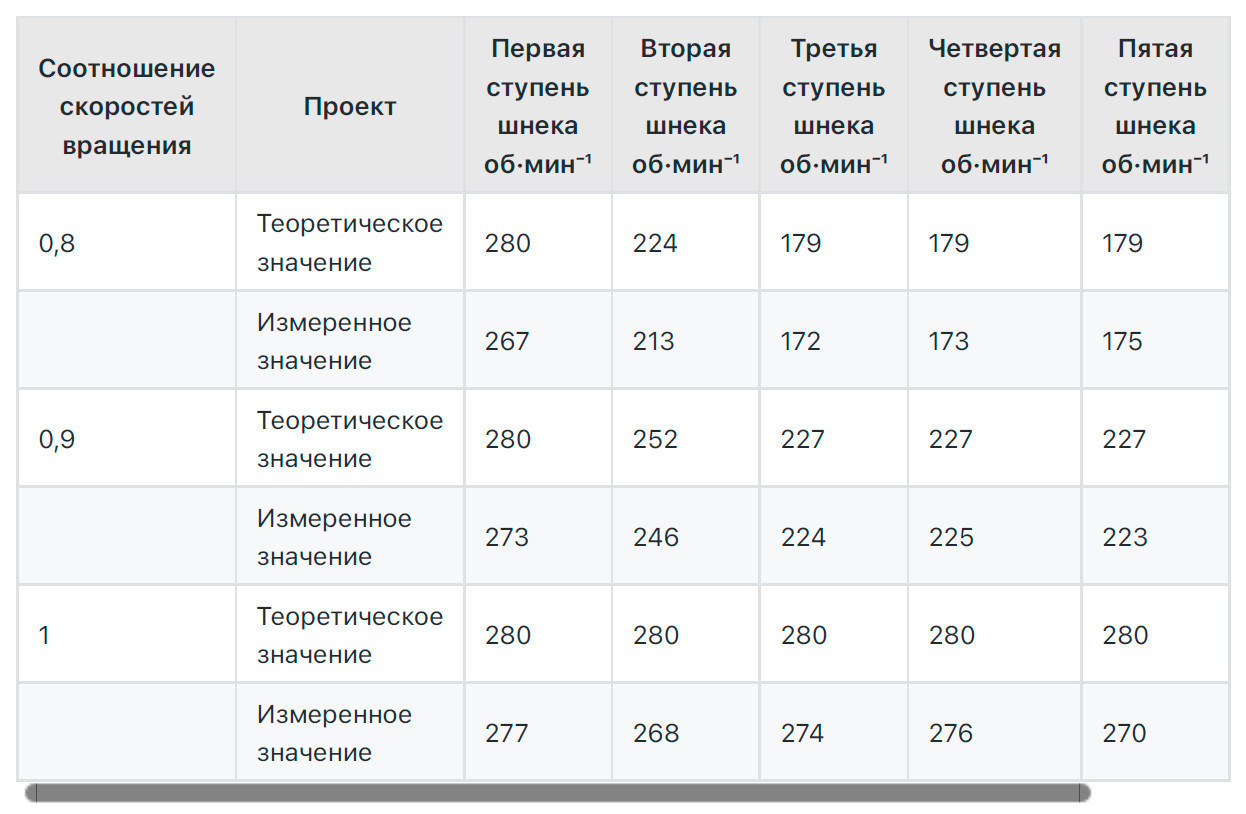Таблица 5. Результаты испытаний производительности шнека при различных соотношениях скоростей вращения.