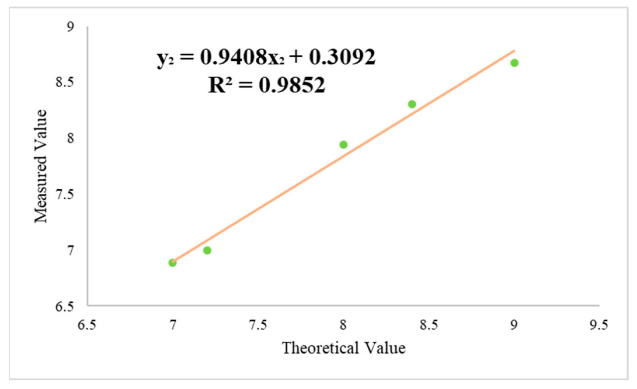 Кроме того, теоретические значения частоты возбуждения брались как ось х, а измеренные значения как ось у. График рассеяния, сформированный этими значениями, подвергался подгонке кривой математического отношения, что можно увидеть на рисунке 22. Математическая связь между теоретическими и измеренными значениями после подгонки дается уравнением у - 0,9408х + 0,3092, с значением R2 0,9852, указывающим на надежность модели корректировки.