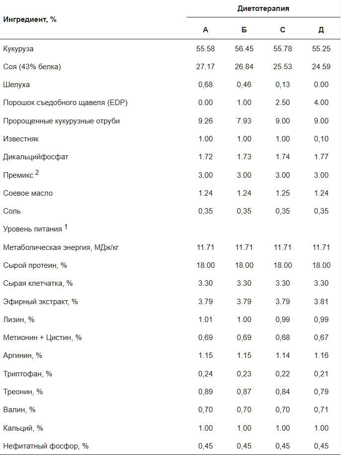 Для этого эксперимента 240 гусят Санхуа были получены от Xiangtian Ge Family Farm (Мааньшань, Китай), провинция Аньхой. Перед началом эксперимента все гусята были взвешены и случайным образом разделены на четыре группы обработки, каждая из которых содержала шесть повторений с 10 гусями на повторение. Диетические обработки определялись следующим образом: Группа А (контроль) получала рацион без добавки EDP, Группа В получала рацион с 1,00% EDP, Группа С получала рацион с 2,50% EDP, а Группа D получала рацион с 4,00% EDP. Формулы рационов для каждой группы были тщательно разработаны на основе питательных стандартов для коммерческих мясных гусей, рекомендованных DB37/T 2784-2016 [13], с учетом конкретных питательных свойств EDP.