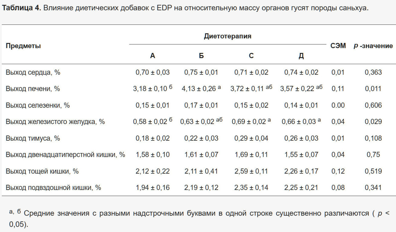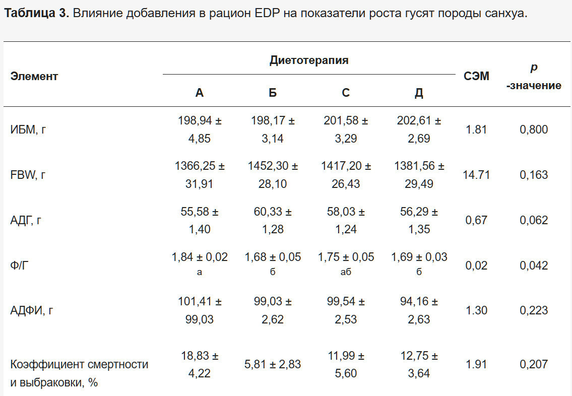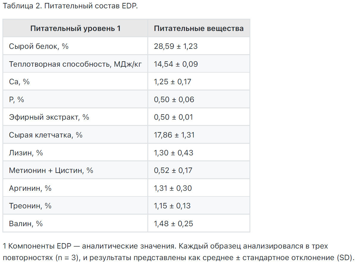 EDP содержит обильные необходимые аминокислоты, включая метионин, лизин, триптофан и валин, предлагая высококачественные источники азота, которые усиливают депонирование азота и способствуют ускоренному росту у гусей [23]. Кроме того, EDP богат полифенолами и флавоноидами, известными своими антиоксидантными, противовоспалительными и иммуномодулирующими эффектами. Эти вещества, вероятно, снижают окислительный стресс, защищают клетки от повреждения свободными радикалами и таким образом помогают поддерживать здоровье гусей [24].