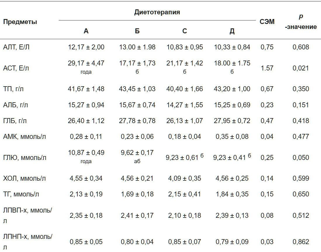 Примечания: ALT: аланинаминотрансфераза; AST: аспартатаминотрансфераза; ТР: общий белок; ALB: альбумин; GLB: глобулин; BUN: азот мочевины крови; GLU: глюкоза; CHOL: общий холестерин; TG: общие триглицериды; HDL-c: холестерин липопротеинов высокой плотности; LDL-c: холестерин липопротеинов низкой плотности; а,Ь средние с разными верхними индексами в одной строке значительно различаются (р < 0,05).