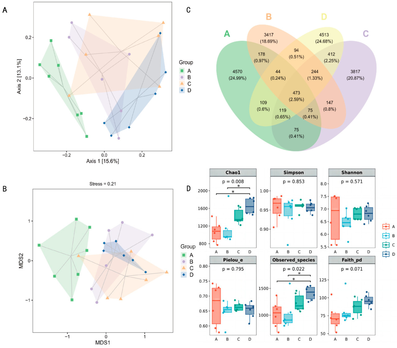 Результаты структуры и разнообразия микробного сообщества слепой кишки показаны на Рисунке 1. Как анализ главных координат (РСоА), так и немногомерное шкалирование (NMDS) продемонстрировали значительные различия в структурах микробных сообществ слепой кишки между группами обработки (Рисунок 1А,В). Анализ РСоА продемонстрировал четкое разделение микробного сообщества в Группе А от тех в Группах В, С и D, предполагая заметные межгрупповые различия (р < 0,05). Анализ NMDS®—подтвердил это открытие, раскрывая четкое разделение между Группой А и другими группами. Анализ диаграммы Венна показал, что Группы А, В, С и D имели 4570, 4513, 3817 и 3417 уникальных OTU соответственно, с только 109 OTU, общими для всех четырех групп (Рисунок 1L). Эти результаты указывают на то, что хотя есть некоторые общие микробные виды между группами, каждая группа обработки также содержала большое количество уникальных микробных сообществ. Результаты альфа-разнообразия (Рисунок 1D) показали, что индекс Chad и количество наблюдаемых видов в Группах А и В были значительно ниже, чем в Группе D (р < 0,05), в то время как индексы Симпсона и Шеннона не показывали значительных различий между группами (р > 0,05).