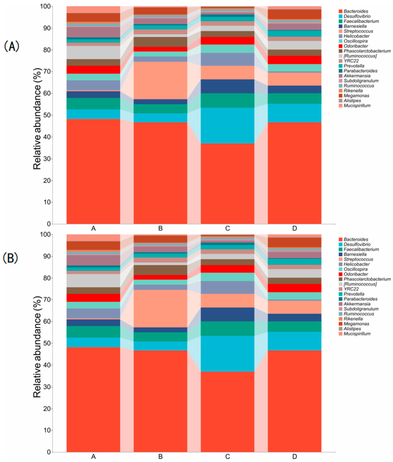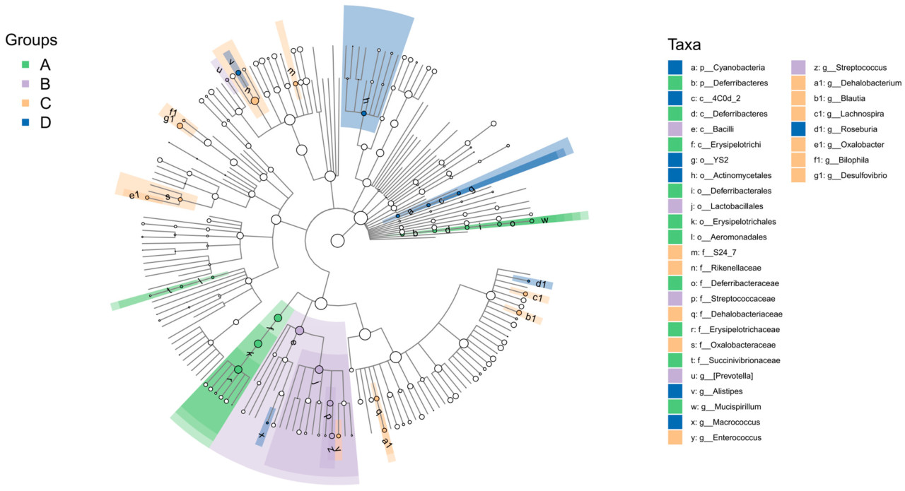 Рисунок 2 отображает состав и относительные пропорции микробных сообществ слепой кишки. Состав микробиоты слепой кишки на уровне филума был похожим во всех группах обработки, с топ-10 филумами: Bacteroidetes, Firmicutes, Proteobacteria, Verrucomicrobia, Actinobacteria, Deferribacteres, Tenericutes, Elusimicrobia, Lentisphaerae и Cyanobacteria (Рисунок 2A). На уровне рода состав микробиоты слепой кишки также был похожим между группами, с топ-20 родами: Bacteroides, Desulfovibrio, Faecalibacterium, Barnesiella, Streptococcus, Helicobacter, Oscillospira, Odoribacter, Phascolarctobacterium, [Ruminococcus], YRC22, Prevotella, Parabacteroides, Akkermansia, Subdoligranulum, Ruminococcus, Rikenella, Megamonas, Alistipes и Mucispirillum (Рисунок 2B). Для лучшей оценки вариаций в составе видов между образцами, визуализации тенденций обилия видов и выявления ключевых маркерных видов между группами были созданы кладограммы LEfSe (Рисунок 3). В Группе А значительно обогащенным филумом был Deferribacteres, с родом Mucispirillum, заметно обогащенным. В Группе В значительно обогащенными родами и таксонами были Prevotella и Streptococcaceae. В Группе С обогащенными таксонами были Desulfovibrio, Dehalobacterium и Enterococcus. В Группе D значительно обогащенным филумом был Cyanobacteria, с родом Alistipes, заметно обогащенным.