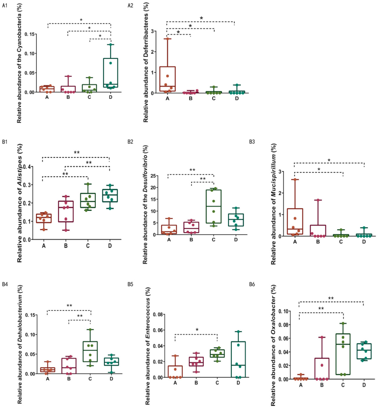 Рисунок 4 (А1,А2) отображает филумы с заметными различиями в относительном обилии между группами обработки на уровне филума. Группа D имела значительно более высокое относительное обилие Cyanobacteria по сравнению с другими группами (р < 0,05) (Рисунок 4 (А1)), в то время как Deferribacteres показывали значительно большее относительное обилие в Группе А по сравнению с остальными (р < 0,05) (Рисунок 4 (А2)). Рисунок 4 (В1-В6) отображает роды с значительными различиями в относительном обилии между группами обработки на уровне рода. Alistipes и Oxalobacter имели значительно более высокое относительное обилие в Группах С и D по сравнению с Группой А (р < 0,01) (Рисунок 4 (В1,В6)). Desulfovibrio, Dehalobacterium и Enterococcus показывали значительно более высокое относительное обилие в Группе С по сравнению с контрольной группой (р < 0,05) (Рисунок 4 (В2,В4,В5)). Относительное обилие Mucispirillum было значительно больше в Группе А по сравнению с другими группами обработки (р < 0,05) (Рисунок 4 (ВЗ)).