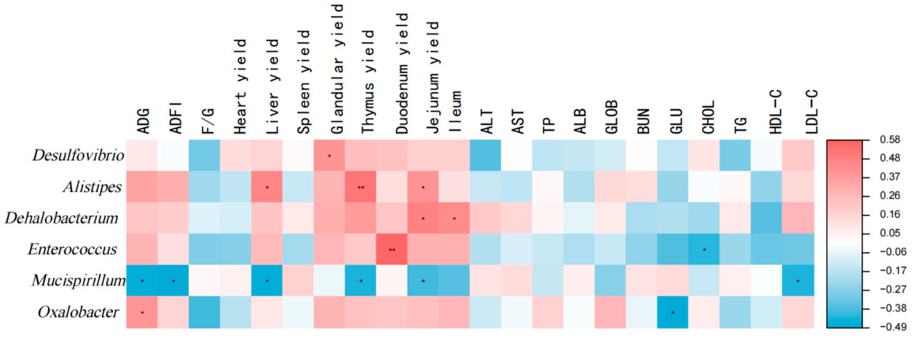 Результаты анализа корреляции отображены на Рисунке 5. Desulfovibrio демонстрировал значительную положительную корреляцию с относительной массой железистого желудка (р < 0,05). Alistipes демонстрировал значительную положительную ассоциацию с относительными массами печени, тимуса и тощей кишки (р < 0,05). Dehalobacterium показывал значительную положительную корреляцию с относительными массами тощей и подвздошной кишки (р < 0,05). Enterococcus демонстрировал значительную положительную ассоциацию с относительной массой двенадцатиперстной кишки и отрицательную корреляцию с уровнями сывороточного CHOL (р < 0,05). Mucispirillum демонстрировал значительную отрицательную корреляцию с ADG, ADFI и уровнями LDL-C, а также с относительными массами печени, тимуса и тощей кишки (р < 0,05). Oxalobacter демонстрировал сильную положительную корреляцию с ADG и обратную корреляцию с уровнями сывороточного GLU (р < 0,05).