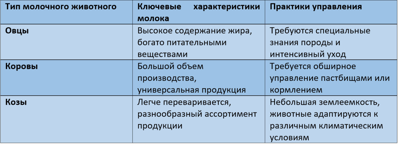Каждый тип молочного производства имеет свои уникальные преимущества и проблемы. «Овечье» молочное животноводство часто сравнивают с «коровьим» и «козьим» с точки зрения производства молока, методов управления и рыночного спроса.