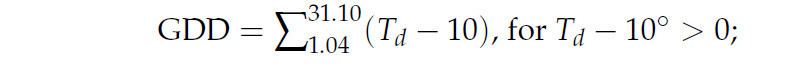 Состояние виноградной лозы, поврежденной весенними заморозками, оценивалось в 2024 году с использованием образцов из полевой коллекции винограда Национального научно- исследовательского института садоводства в Скерневицах, Польша (широта 51.9627° с.ш., долгота 20.1666° в.д.). Исследование проводилось на образцах, выращенных на почве типа лювисоль, слабокислой (pH 6,3 в 1 М KCI). Почва содержала 2,2% органического вещества. Эти параметры почвы отслеживаются и корректируются ежегодно. В исследуемом году они незначительно отличались от предыдущих лет. Умеренный климат центральной Польши, переходный от морского к континентальному, характеризуется холодными зимами и жарким летом, а также относительно низким и изменчивым количеством осадков. В 2014-2023 годах средняя температура воздуха составляла -0,2 °C в январе, 19,4 °C — в июле и 14,2 °C — в течение вегетационного периода винограда (1.04-31.10). Средний безморозный период длился 164 дня, а сумма активных температур (GDD) составляла 1133 °C. GDD рассчитывается по следующей формуле: