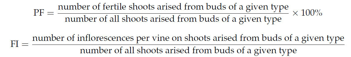 После повреждения весенними заморозками побегов, растущих из первичных почек, развились побеги из вторичных, базальных и латентных почек. В период с 13 по 17 мая на каждой лозе и для каждого из трех упомянутых типов почек подсчитывались отдельно все развившиеся побеги, включая плодоносные побеги (те, у которых было хотя бы одно соцветие), и общее количество соцветий. Для выражения фактической плодоносности трех типов почек использовались два показателя: процент плодоносных почек (PF) и индекс плодоносности (FI), который показывает среднее количество соцветий (гроздей) на почку.