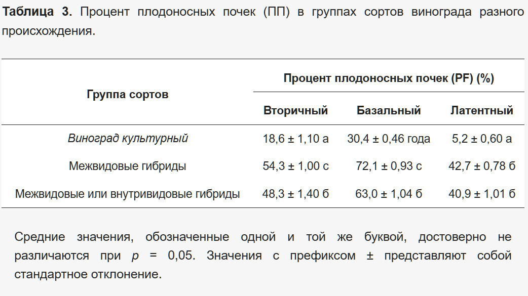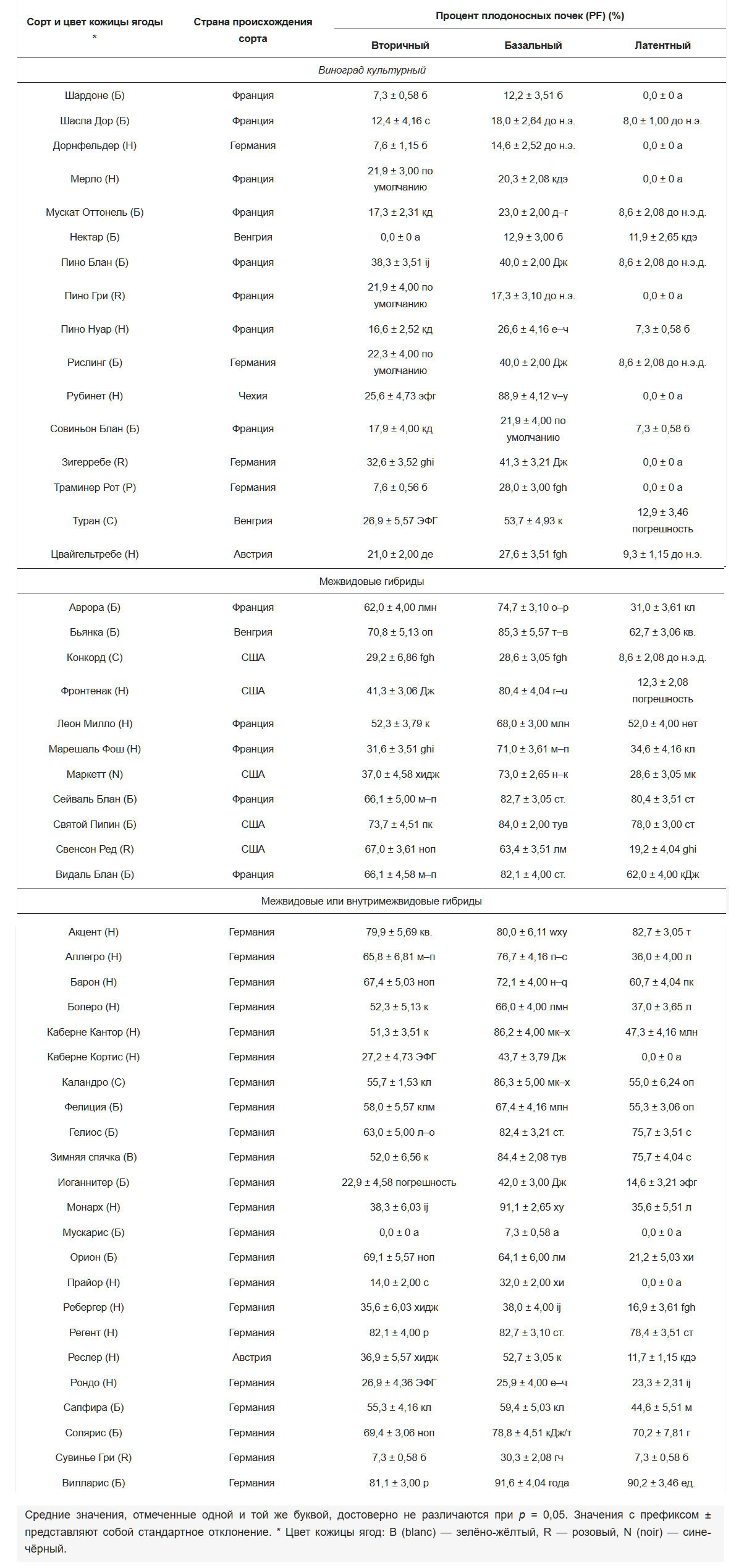 1. Сорта винограда значительно различаются по своей способности компенсировать урожай после повреждения весенними заморозками за счет плодоносности вторичных, базальных и латентных почек.