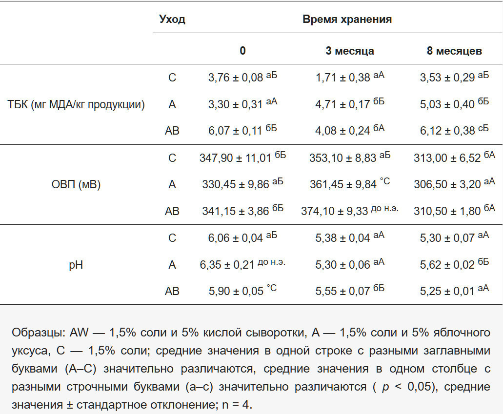 Оценка значений ОВП показала, что образцы С и AW характеризовались наибольшим значением ОВП как после производства (347,90 и 341,15 мВ), так и после 8 месяцев хранения (313,00 и 310,50 мВ). После 8 месяцев хранения во всех образцах окороков было отмечено значительное ((р < 0,05)) снижение значения окислительно-восстановительного потенциала.
