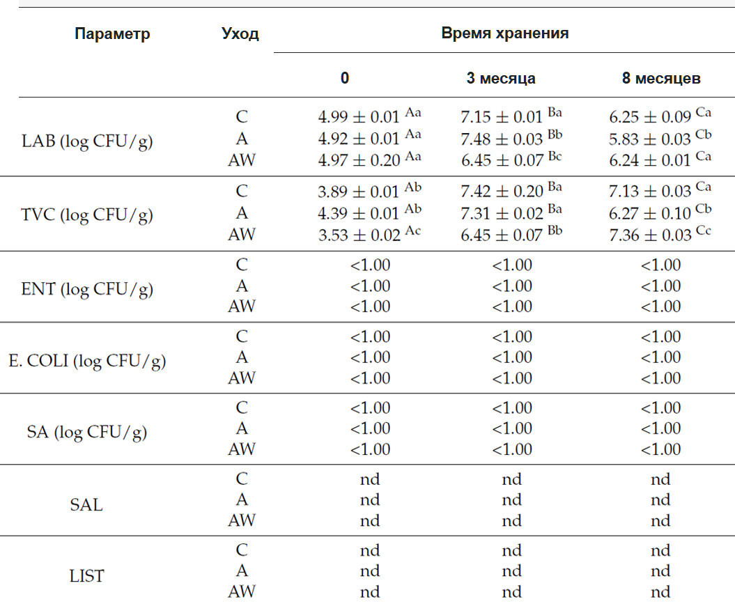 AW — 1,5% соли и 5% кислой сыворотки, A — 1,5% соли и 5% яблочного уксуса, C — 1,5% соли; LAB — молочнокислые бактерии, TVC — общее количество жизнеспособных микроорганизмов; ENT — бактерии семействаEnterobacteriaceae, E. COLI —Escherichia coli, SA — коагулазоположительные стафилококки (Staphylococcus aureusи другие виды), SAL —Salmonellaspp., LIST —Listeriaspp., включаяL. monocytogenes; <1,00 — количество ниже предела обнаружения метода посева; nd — не обнаружено в 25 г продукта; средние значения в одной строке с разными заглавными буквами (A–C) значительно различаются, средние значения в одном столбце с разными строчными буквами (a–c) значительно различаются (p< 0,05); средние значения ± стандартное отклонение; n = 4.