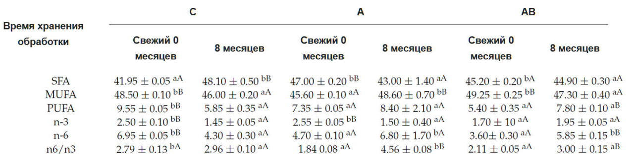 AW — 1,5% соли и 5% кислой сыворотки, A — 1,5% соли и 5% яблочного уксуса, C — 1,5% соли; НЖК — сумма насыщенных жирных кислот; MUFA — сумма мононенасыщенных жирных кислот; PUFA — сумма полиненасыщенных жирных кислот; n-3 — сумма n-3 жирных кислот; n-6 — сумма n-6 жирных кислот; средние значения в одной строке с разными заглавными буквами (A, B) достоверно различаются, средние значения в одном столбце с разными строчными буквами (a, b) достоверно различаются (p< 0,05), средние значения ± стандартное отклонение; n = 4.