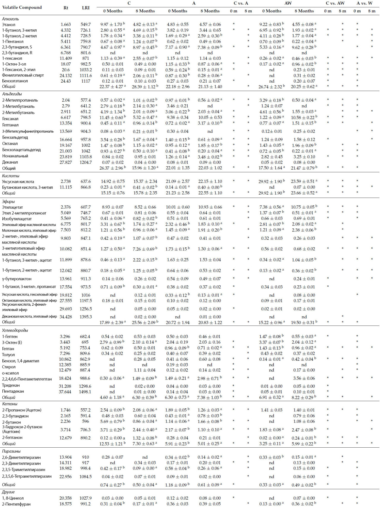 Rt — время удерживания; LRI — линейный индекс удерживания; метод идентификации летучих веществ: масс-спектры + LRI; AW — 1,5% солевой и 5% кислой сыворотки, A — 1,5% солевой и 5% яблочного уксуса, C — 1,5% соли; nd — не обнаружено. Значения с разными верхними индексами достоверно различаются (p< 0,05) по времени хранения; значения со звёздочками достоверно различаются (p< 0,05) по обработке от контрольного образца; n = 3.