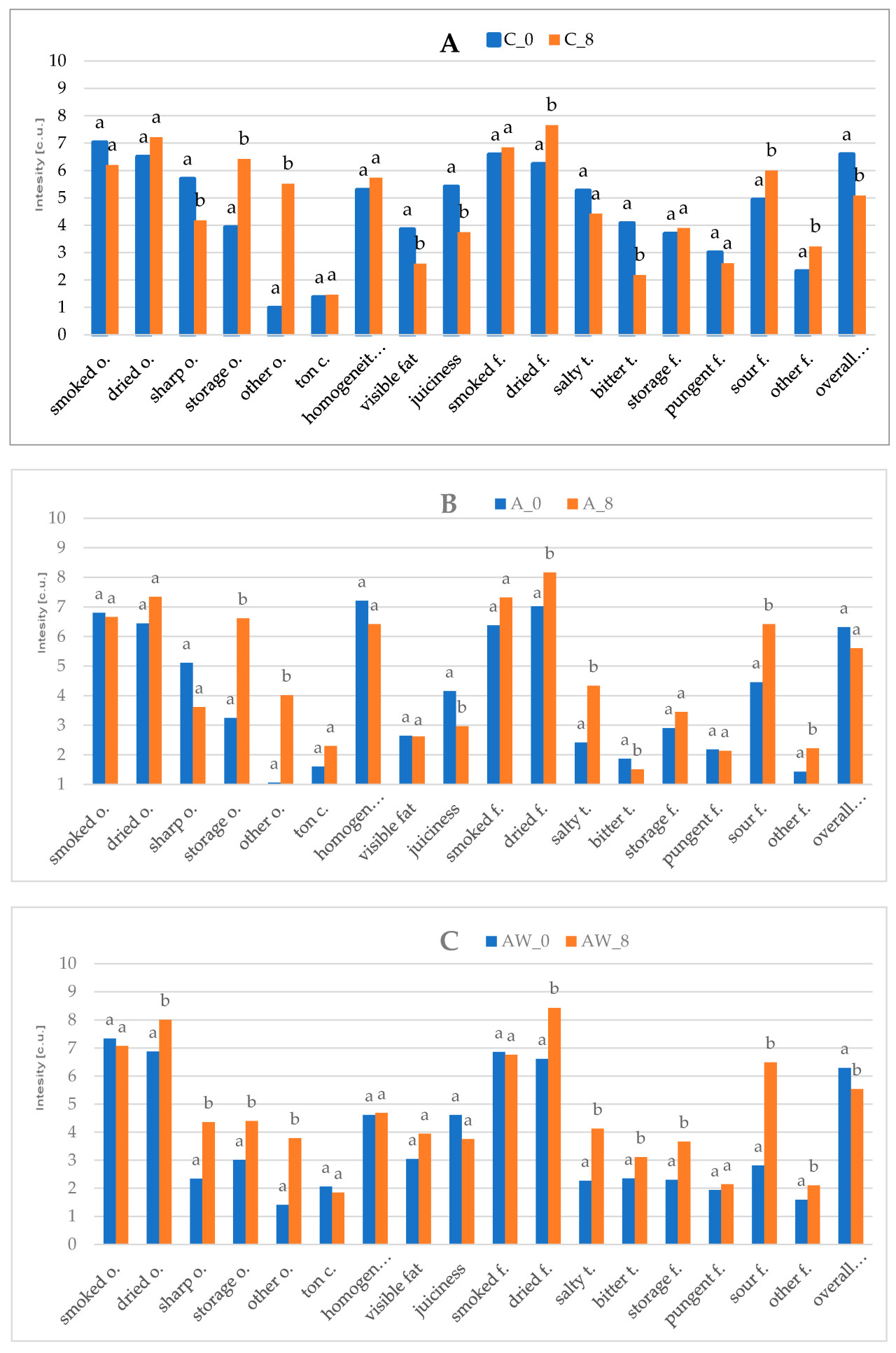 На Рисунке 1 А-Б-В представлены три вида ферментированных говяжьих образцов и изменения сенсорного профиля после 8 месяцев хранения. Анализ данных, полученных методом QDP, относительно контрольного образца С (Рисунок 1А) показывает, что tested материал в течение 8 месяцев хранения при 4 °C значительно изменился в terms of острых, лежковых и других атрибутов запаха, а также сухих, кислых и других вкусовых нот. Более того, наблюдалось снижение сочности и, в конечном итоге, общего сенсорного качества ((р < 0,05)). Та же тенденция наблюдалась в случае хранившихся образцов с добавлением яблочного уксуса (А) и с добавлением кислой сыворотки (AW) (Рисунок 1В,С). Период хранения в течение 8 месяцев при низких температурах привел к значительным изменениям сенсорного профиля в степени, similar по сравнению с контрольным образцом. Общее качество контрольных окороков (С) и окороков с яблочным уксусом и кислой сывороткой находилось на удовлетворительном уровне после производства (свыше 6 у.е.) и после 8 месяцев хранения (свыше 5 у.е.). Общее качество снизилось во всех образцах после хранения, что могло быть вызвано увеличением интенсивности других запахов, других вкусов и запахов лежкости, а также уменьшением интенсивности сочности. Кроме того, было продемонстрировано значительное увеличение кислых вкусовых нот.