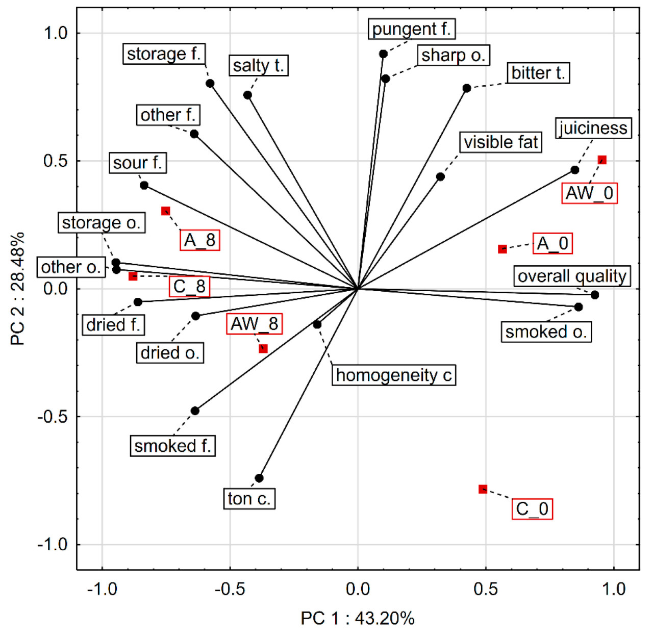 Хранение при 4 °C в течение 8 месяцев на графике РСА указывает на то, что сенсорное качество образцов значительно изменилось, о чем свидетельствует положение образцов на противоположной стороне вектора общего сенсорного качества. Кроме того, хранившиеся образцы AW_8, С_8 и А_8 расположены near векторов, называемых запах лежкости, другой запах, а также сухой запах и вкус. Положение связано с более низким общим качеством хранившегося материала.