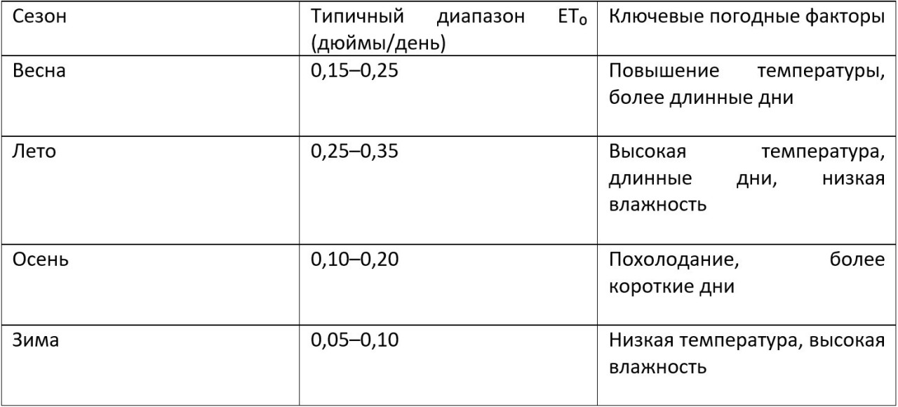 Коэффициенты урожайности представляют собой данные о фактическом потреблении воды растениями, собранные за десятилетия. Использование устаревших или обобщенных значений может сбить вас с толку на 20% и более.