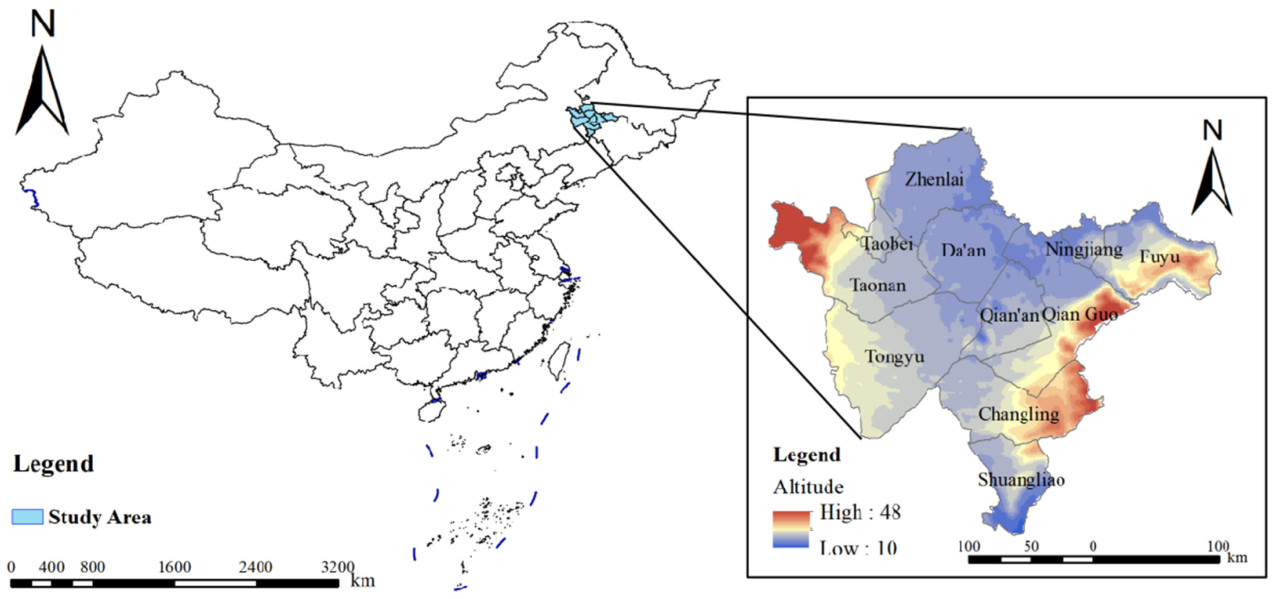 ЗПЦ, показанная на Рисунке 1, охватывает город Байчэн, город Сунъюань и город Шуанляо, расположенные в ЗПЦ. Эта территория признана одним из трех крупнейших в мире регионов содового засоления и также является одной из наиболее экологически уязвимых территорий в пределах провинции Цзилинь. ЗПЦ расположена внутри материка на северо-востоке Китая и находится в зоне умеренного континентального муссонного климата. Эта зона характеризуется выраженными климатическими вариациями и значительными температурными колебаниями в течение года, со среднегодовой температурой в диапазоне от ( 4^ ) до ( 6^ ). Осадки в основном сосредоточены в июле и августе, со среднегодовым количеством осадков от 200 до 500 мм, показывая тенденцию к снижению с юго-востока на северо-запад. Среднегодовое испарение в районе исследования варьируется между 1500 и 1900 мм. За последние десятилетия рост населения в сочетании с плохим управлением ВЗР и увеличением антропогенной активности привел к деградации системы ВЗР в ЗПЦ, негативно влияя на экологическую среду.