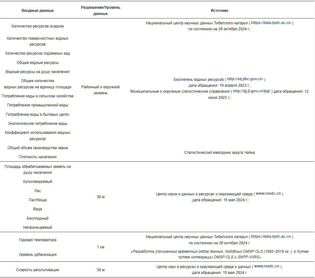 Данные в основном разделены на два раздела (Таблица 1). Первый раздел включает основную информацию для анализа водных ресурсов в различных районах и уездах ЗПЦ. Второй раздел включает основную информацию для анализа земельных ресурсов в различных районах и уездах ЗПЦ. Данные относительно площади различных типов землепользования были получены из ежегодного набора данных о сетке земного покрова Китая с разрешением 30 м, охватывающего период с 1990 по 2022 год [28]. Дополнительно, данные о численности населения и общем объеме производства зерна были получены из соответствующих изданий «Статистического ежегодника уездов Китая» за соответствующие годы.