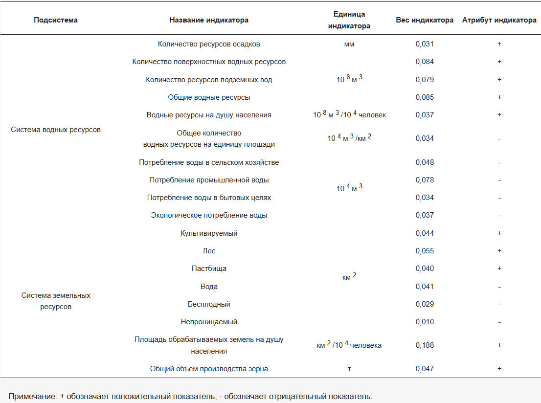 Создание комплексной системы показателей является фундаментальным для объективной оценки степени сопряжения между ВЗР. Руководствуясь принципами научной строгости, рациональности и комплексности, показатели были установлены и отобраны с учетом особенностей использования ВЗР в районе исследования в сочетании с результатами полевых исследований и конкретными региональными атрибутами. Используя данные, собранные с 2006 по 2020 год относительно ВЗР в ЗПЦ, 18 показателей были скомпилированы для создания системы показателей сопряжения для ВЗР. В данном исследовании использовался комплексный подход взвешивания для решения проблем, вызванных чрезмерной субъективностью при расчете показателей с помощью субъективных методов взвешивания, и трудностей в захвате различных степеней акцента, которые лица, принимающие решения, придают различным показателям, при использовании объективных методов взвешивания. Этот подход интегрирует субъективные (Анализ иерархий) и объективные (Метод энтропийного веса) методы взвешивания. Путем усреднения результатов, полученных этими двумя методами, были установлены окончательные значения весов для каждого показателя в системе ВЗР (Таблица 2) [29,30]. За исключением доли сельскохозяйственного, промышленного, бытового и экологического водопользования в показателях водных ресурсов, а также площади оголенных земель и непроницаемых поверхностей в показателях земельных ресурсов, которые относятся к негативным показателям, все остальные показатели были позитивными.