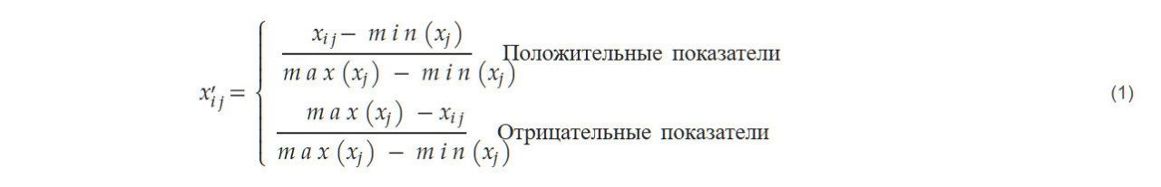 где x_ij представляет исходные данные для j-го показателя в регионе i за определенный год, где max(xj) и min(xj) — максимальное и минимальное значения исходных данных для j-го показателя соответственно, и xij — значение после стандартизации.
