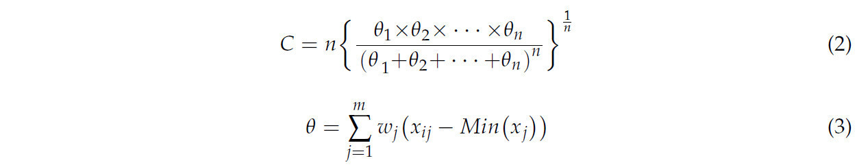 где 𝜃𝑛 представляет комплексный оценочный индекс подсистемы, ( w_j ) представляет вес показателя (Таблица 2), ( n ) представляет количество подсистем, и ( C ) — степень сопряжения, с диапазоном значений [0, 1]. Поскольку есть только две подсистемы, водные ресурсы и земельные ресурсы, ( n ) равно 2; 𝜃1 и 𝜃2 представляют комплексные оценочные индексы систем водных и земельных ресурсов соответственно.